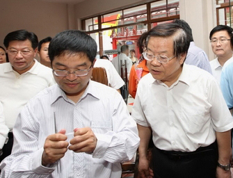 国家文化部部长蔡武(右)现场观看《横江丝画》制作技艺