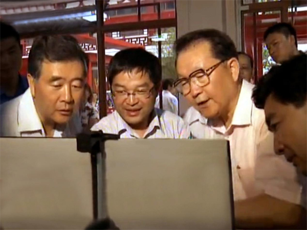 国务院副总理汪洋(左)和原中央政治局常委李长春(右)观看《横江丝画》制作技艺