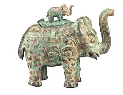 经常看《动物世界》的人都知道,象群中母象对小象关怀备至,即使某只小象与妈妈走失了,其他有能力的母象也会将这只小象视作自己的孩子来抚育。美国弗瑞尔美术馆藏有一件商代子母象尊,这只子母象尊模拟象形,高17.2厘米,长21.2厘米,宽10.6厘米,由容器和盖两部分组成。容器为母象造型,它肥硕丰满,长鼻高举(母象鼻子中空,兼为尊的流),四足坚实,尾部有立体纹饰,周身布满繁复优美的装饰花纹,有兽面纹、夔纹、 四瓣花纹,以云雷纹衬托,给人以雍容华贵之感。母象背部有一椭圆形口,口上有一盖,盖上铸有一站立的小象作为盖钮,其造型与母象相同,只是体形略小。