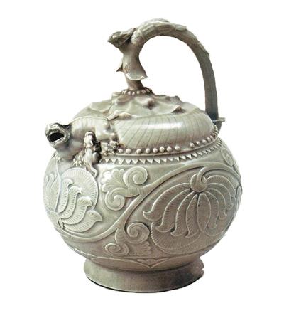 青釉提梁倒灌壶属于耀州窑精品,耀州窑是我国古代北方八大名窑之一,它始于唐,兴于宋,衰落于明,以生产工艺精湛的刻花青瓷驰名中外。五代时期耀州窑多仿晚唐与五代的金银器皿,联系到青釉提梁倒灌壶的别致造型,有学者认为其或为仿照唐代金银器制成,且具有西域风格。